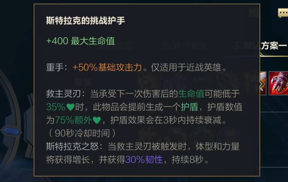 血手的被动是在自身血量低于35%时,可以生成一个额外的75%血量值的护盾,护盾在3秒内逐渐衰减,还增加30%的韧性持续8秒,韧性可以减控,可以跟前面的水银鞋搭配可以在血手被动触发时达到65%韧性。