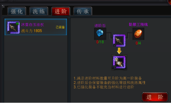 带技能的紫色神装和橙色神装均可通过进阶功能进阶上去,每次进阶需要消耗不同的材料。