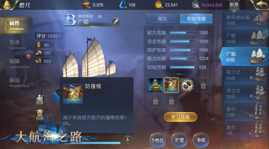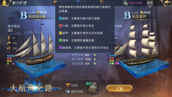 主要提升船只的航行速度,在船只的左下角框图中,如果蓝色的小正方形越多,证明该船只的航行速度成长越高。如果你对船速有特别的要求,不妨多关注一下这类属性。
