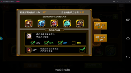 当然到这里有人会问,扫荡的话,关卡中的钓鱼机会要怎么办?其实这些都是不需要担心的,宠物扫荡就等于是关卡扫荡了,再保证能自动结算钓鱼数据的同时,玩家在副本中获得的经验金币和装备也会一并结算 的,如果运气好些,挂机挂到极品装备也是很正常的事。