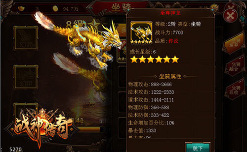 战神配天龙,行天下而不惧生死,英雄就应该有一个好坐骑,在《战神传奇》的“龙行天下”中,坐骑玩法重降人世,助你登上沙城之巅。四转玩家即刻开启坐骑玩法,三大坐骑获取方法带你玩转坐骑:1、前往许愿获得,就算不能获得坐骑也能得到稀有装备噢;2、参与帮会领地争夺战获得顶级坐骑;3、累计充值不仅有返利还有威武巨型坐骑相送!更有进阶、融合、回收等多重养成玩法,培养震天白虎、至尊神龙只在新版本《战神传奇》!