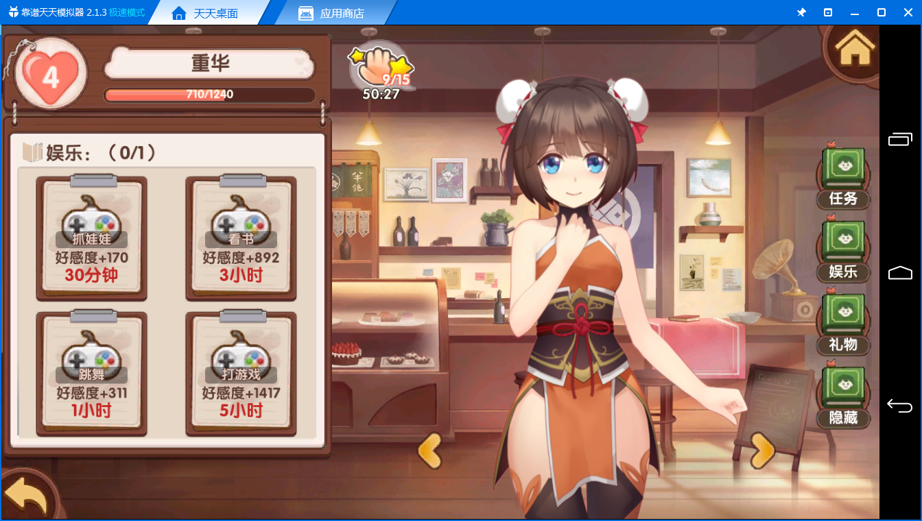 我们第一个接触的伙伴,也是最开始养成系统中出现的角色就是SR重华,在宅邸里不但可以360度的查看重华在宅邸中做什么,还可以通过点击与其进行沟通互动,做一些可爱的小任务,培养一些好感度。