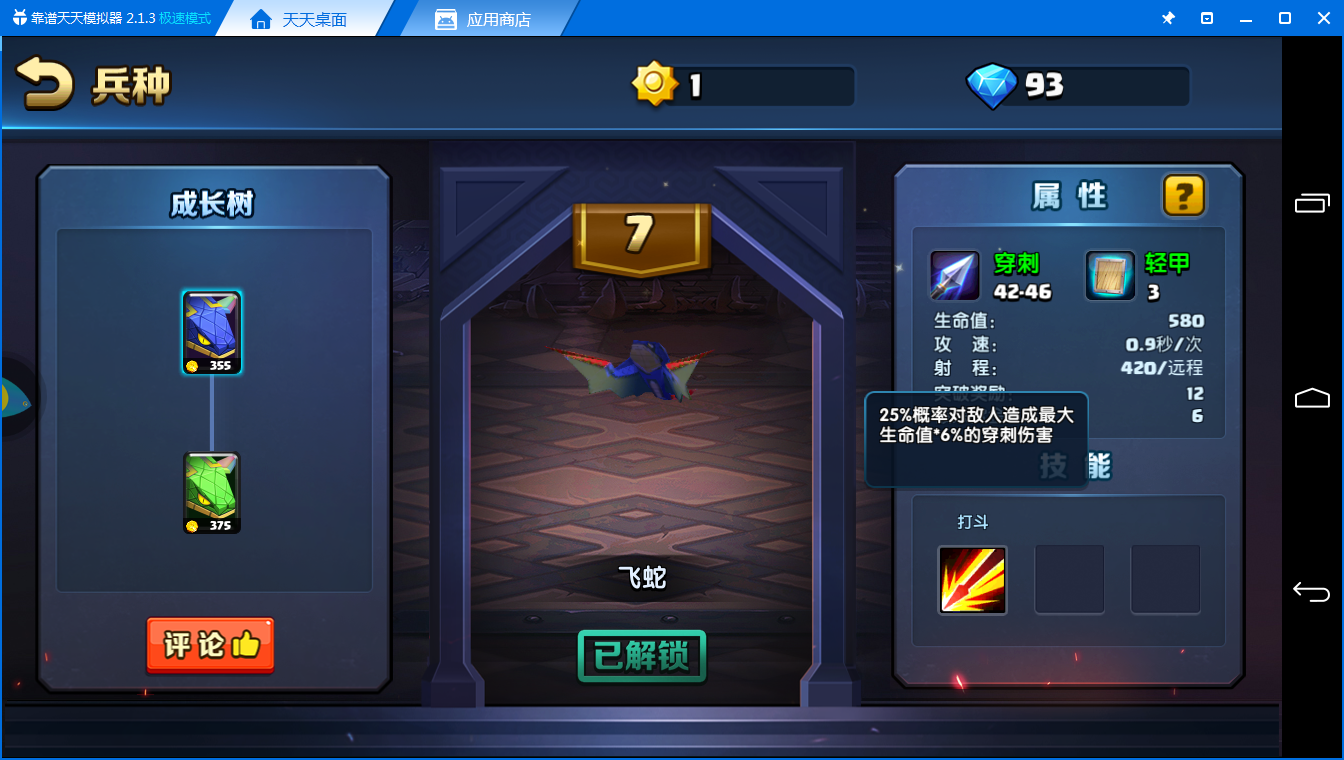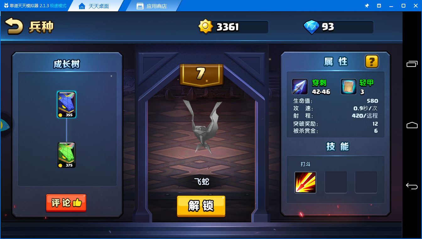 今天又凑够了一个解锁的金币,所以赶紧解锁了一个海洋军团的新兵种——飞蛇。