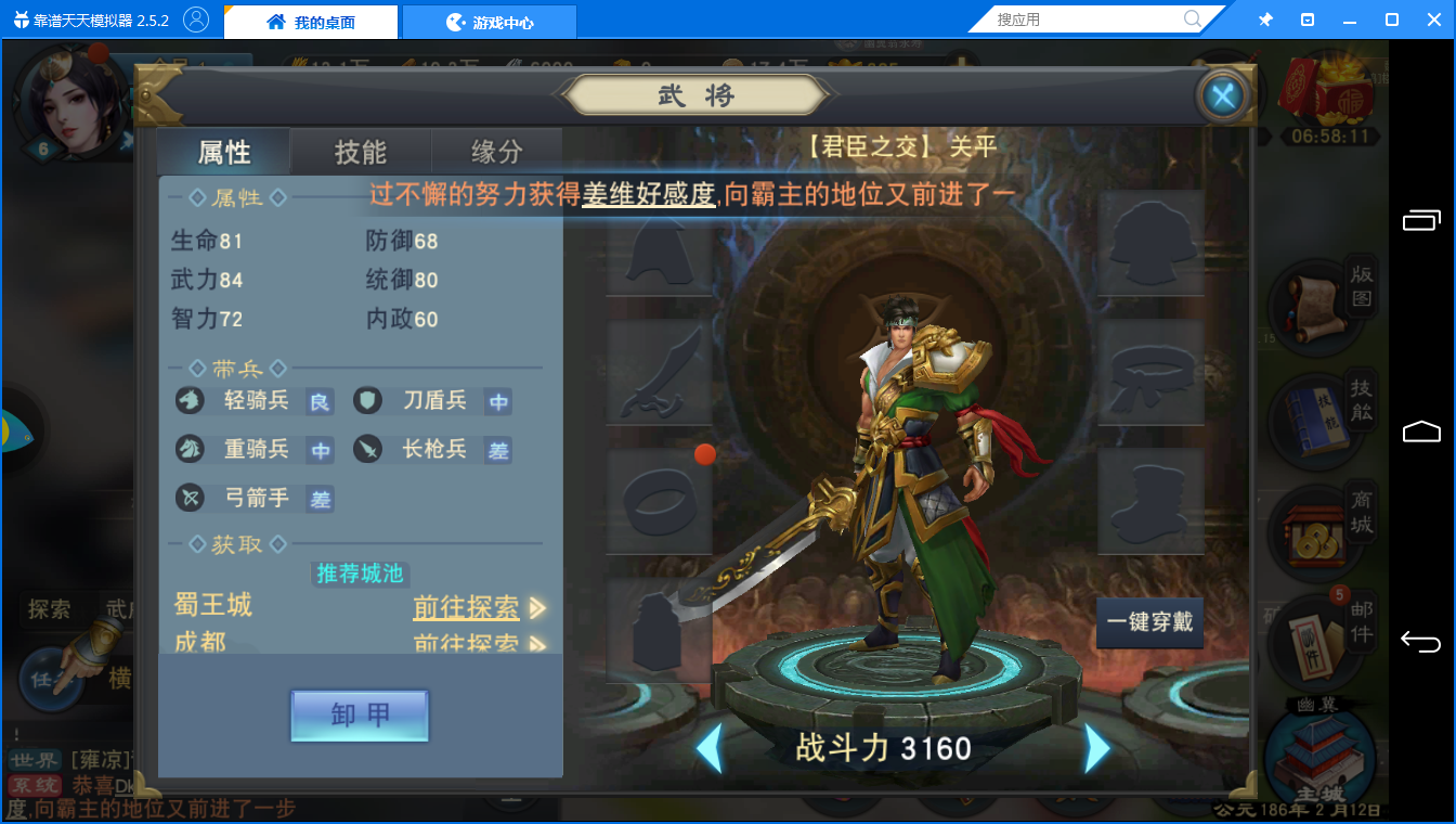 每个武将都有独立的技能属性以及天赋,当然主角的角色是会随着游戏玩家自身的进阶而提升的,也不用担心会成为累赘。