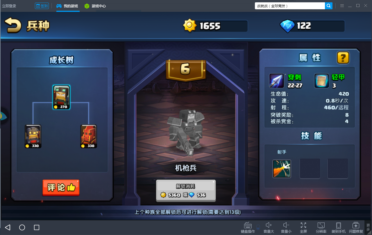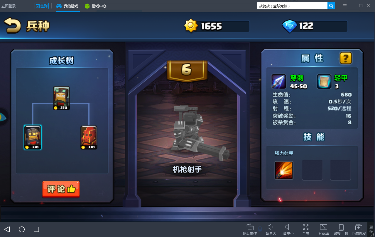 在战就战中机枪兵是一个可以进阶成前排肉盾也能进阶成后排输出的兵种。
