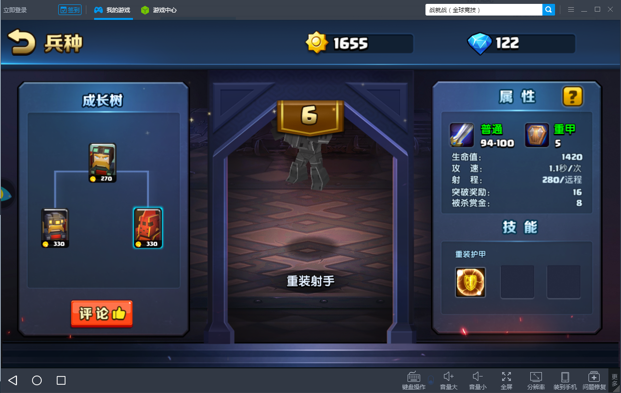 不同于强化版的机枪兵,重装射手是可以扛前排的半远程兵种,5点重甲,94~100普通伤害,1420的血量。