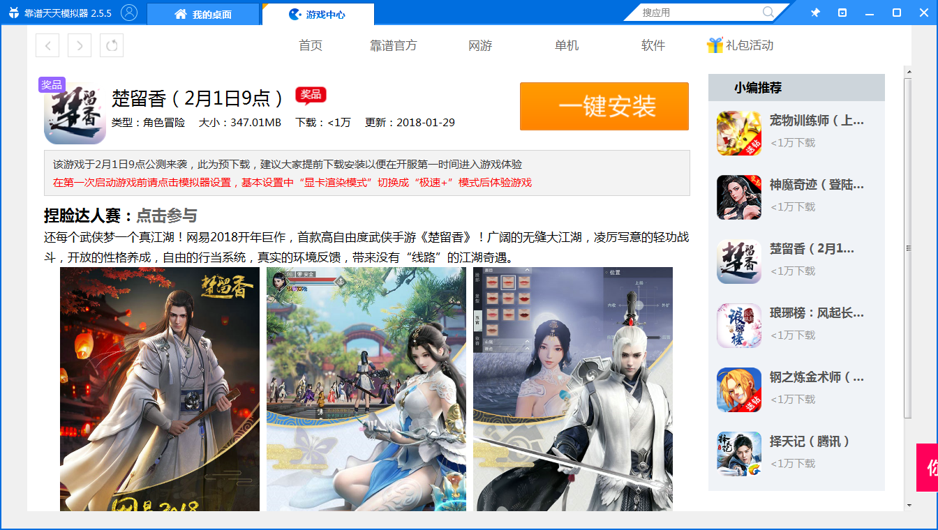 最近在朋友圈老是看了发《楚留香》的截图,还以为是某款新的3D武侠网游巨制,画面截图什么的都很唯美,然后今天上天天模拟器我了个去,怎么是款手游?