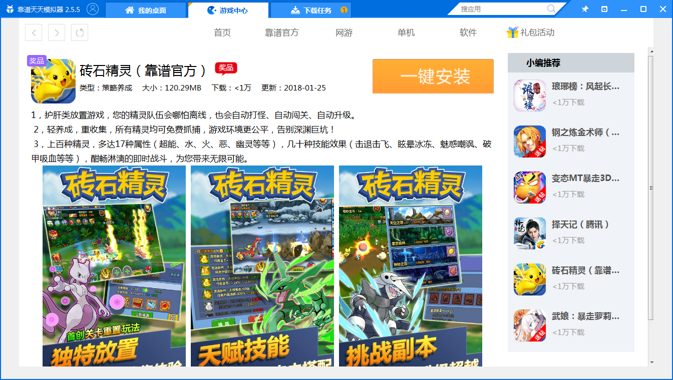 今天在靠谱模拟器上看到了一款神奇宝贝题材的手游——砖石精灵,感觉好长一段时间没有玩这种类型的游戏了,所以就尝试的下了一个。