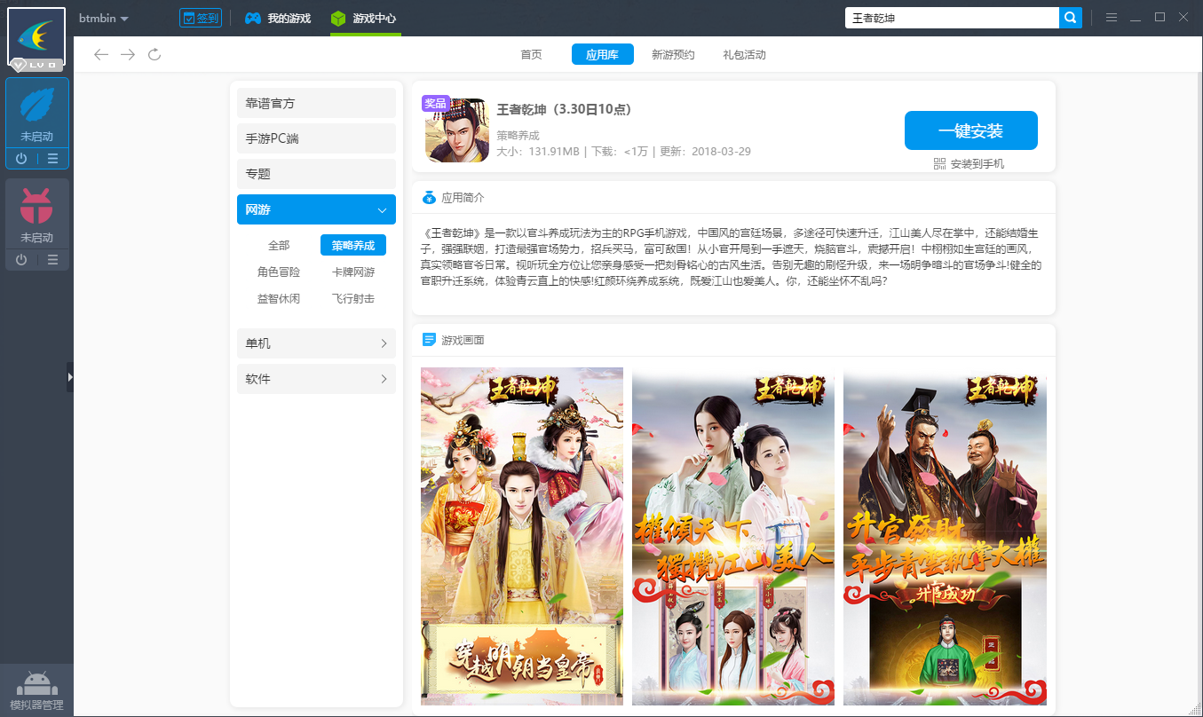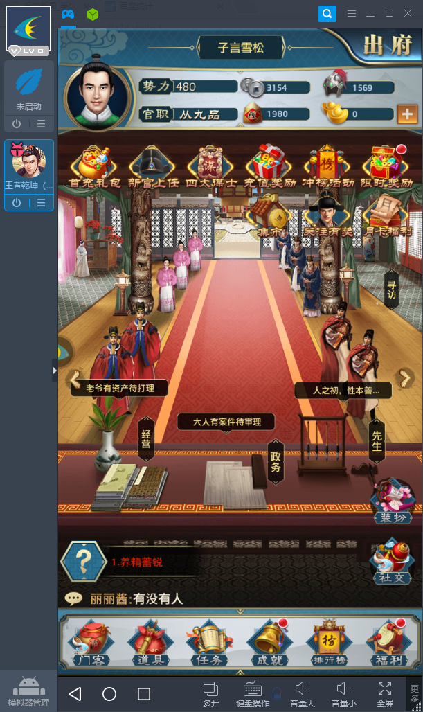 8、然后你就可以在电脑上玩王者乾坤手游了,来一场明争暗斗的官场争斗,健全的官职升迁系统,体验青云直上的快感!红颜环绕养成系统,既爱江山也爱美人!