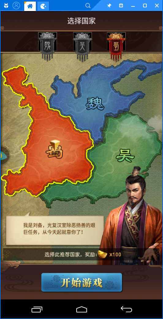魏蜀吴三国,选择系统推荐国家可以额外获得100元宝。