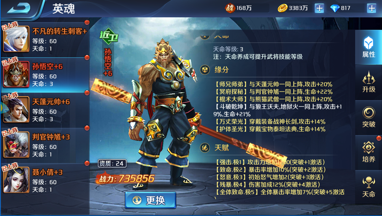 在缘分效果展示一栏和援军助威上,你可以不断的通过替换和选择来查看前后阵容的变化和属性加成。