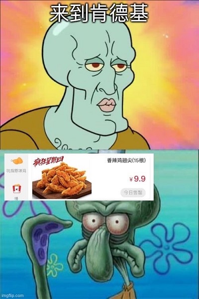 看看你那垂头丧气的吊样 知道今天是什么日子吗 今天是疯狂星期四 吮指原味鸡+黄金脆皮鸡九块九