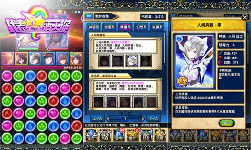 《代表星星消灭你》采用三消对战方式,每次战斗都有机会获得经验卡以及较稀有的人物卡。而在副本和抽卡环节中,获得人物卡的几率更大。这些人物卡牌画面精美,几乎都源于各大神话体系和动漫作品,比如偶像系类目中的【人间兵器系】条目,四位羁绊人物“人间兵器.舰娘”、“人间兵器.初心”、“人间兵器.零”、“人间兵器.夜夜”,人设造型与经典日本动画人物异常相似,不过到底他们是以谁为雏形呢?你大可尽情猜测,在《代表星星消灭你》的游戏对战中,收集精美卡牌,重温童年记忆。