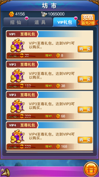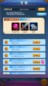 用户购买灵石的地方。玩家也可以在此查看自己的VIP等级、进度和各级VIP的权限