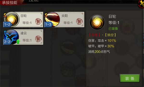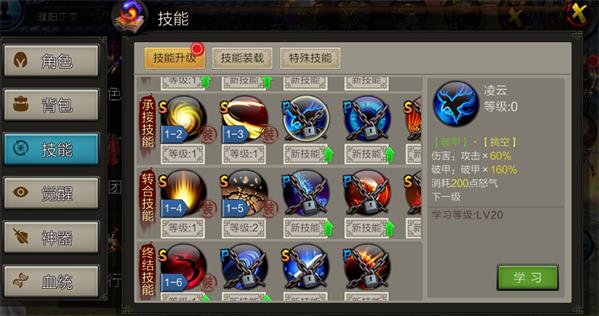 在《疾风三国》中,技能被分为“起”、“承”、“转”、“接”四个阶段。每个阶段都有不同类型的技能可供玩家学习。在面板右边显示着技能的属性,在这里玩家不仅可以学习解锁,还能够对已经学习到的技能进行进一步的强化。