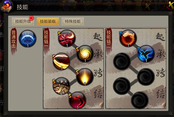 在下图所示的面板中,我们可以看到有“普通攻击”、“技能链一”、“技能链二”三个部分,玩家点击相应的孔可对“起承转接”四个阶段的技能进行更替。技能下方的数字则代表当前技能的等级。在游戏中,玩家连续点击技能按钮就能对相应的技能链进行逐一释放。