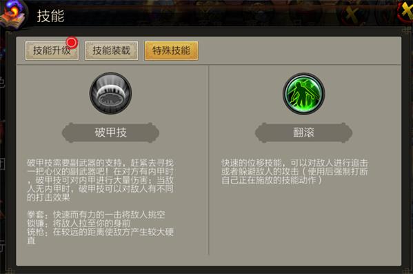 《疾风三国》中实际上还存在着两个特殊技能,一个是翻滚(冲刺),在游戏中玩家可用来躲避敌人的攻击。而另一个则是破甲技能,这个技能将根据玩家所穿戴的副武器而呈现出不同的样式。主要分为近战、远攻和控制型。