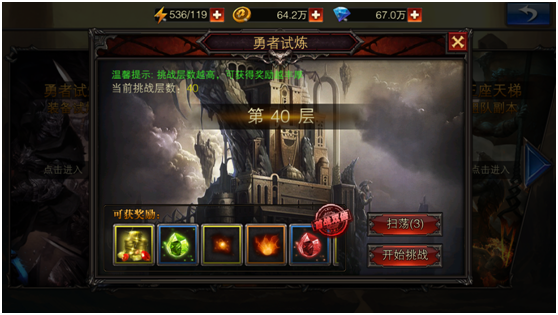 玩家挑战的勇者试炼层数越高,可获得的奖励越丰富哦。