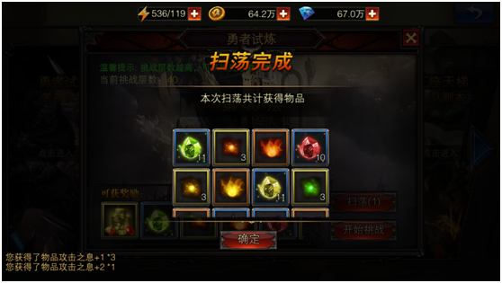 玩家只有通关勇者试炼10关以上才可启用扫荡功能,10关以下不可进行扫荡。