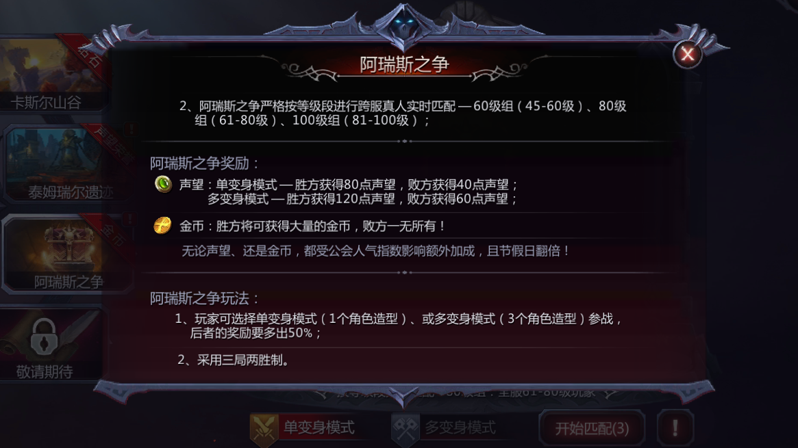 阿瑞斯之争是一个独特的PVP玩法。玩家可单变身模式(单一变身对战)或多变身模式(3个变身对战)参战。每天有3次机会参加阿瑞斯之争,胜利后将获得大量的金币和声望奖励,失败将一无所有,祈祷对手是个菜鸟吧!
