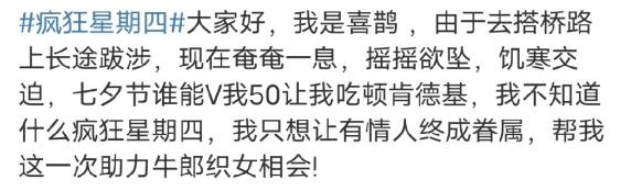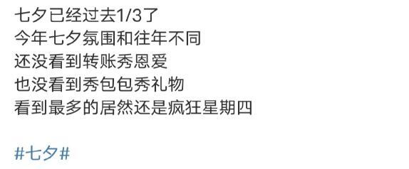 别问我七夕怎么过我,失魂落魄我一笑而过我,保持沉默我不知所措我,大人不记小人过,我沉舟侧畔千帆过。七夕是他们的,但疯狂星期四是肯德基的,V我 50块,我们边吃边说我们的孤寡计划。