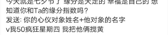 今天夕节,缘分天定, 幸福是自己的 想知道你和Ta的缘分指数吗 发送: 你的心仪对象姓名+你的名字 到我微信并转账500我明天去吃kfc疯狂星期四