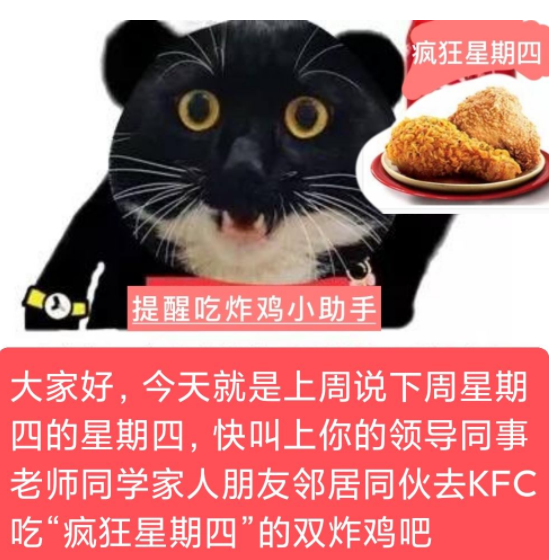 今天是疯狂星期四,转发kfc宣传到5个群,肯爷爷会根据你绑定的微信号,给你送一个全家桶,我试过了,是假的,但上班摸鱼闲着也是闲着,不如挨顿骂。