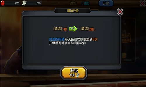 另外酒馆的等级可以用点券升级,只一点很多玩家会忽略,升级之后,每天的免费次数增加,算下来对于玩家后期可以省下一大笔钱。