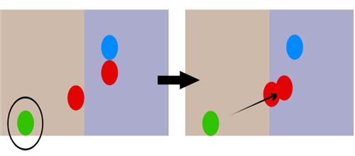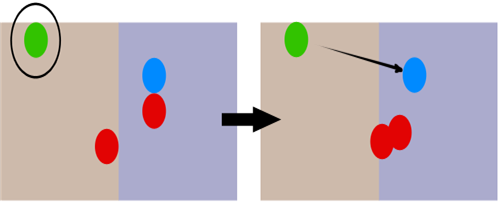 图二,本方将绿色点放置在上方,通过优先击杀自己射程内最近目标的特性,当蓝色点进入绿色点攻击范围内后,绿色点会转火攻击蓝色点,那么穿刺攻击面对穿刺弱点。很容易的就解决掉了对方的蓝色点,减少对手输出,增加本方胜率。