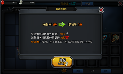 升级(普通升级消耗金币、精炼装备消耗石精炼)