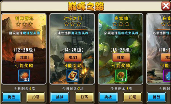 1.在巅峰之路中,每日每个模式都有2次通关的机会,每个副本都会有特殊的通关门槛,分为:物理型、魔法型、怪物英雄、女性英雄、男性英雄。这样就需要玩家的英雄有多种的搭配才可以获得丰厚的额外奖励。