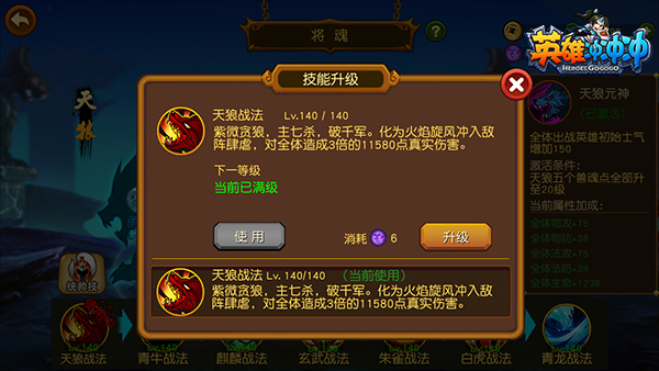 《英雄冲冲冲》拥有7大统帅技:天狼>>青牛>>麒麟>>玄武>>朱雀>>白虎>>青龙。统帅技基本都是真实伤害,无视物防与法防,在查看敌方阵容的时候,大伙可以观察敌方的前排、中排、后排站位。如果敌人在某一个位置站位较多,可以根据实时的情况选择相应统帅技。如果在战斗中可以率先杀死一、两名敌人,整个战局的优势就集中到我方了。