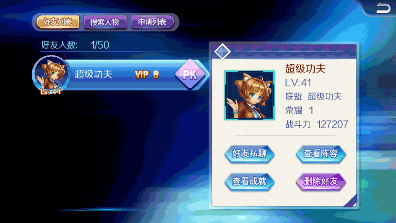 通过好友列表可以查看到自己已经拥有的好友,并且可以了解自己好友的相关信息,如荣耀、战斗力、头衔、阵容、成就等。同时,还可以在这里与好友进行聊天,属于两个人的私聊,述说各自情怀。