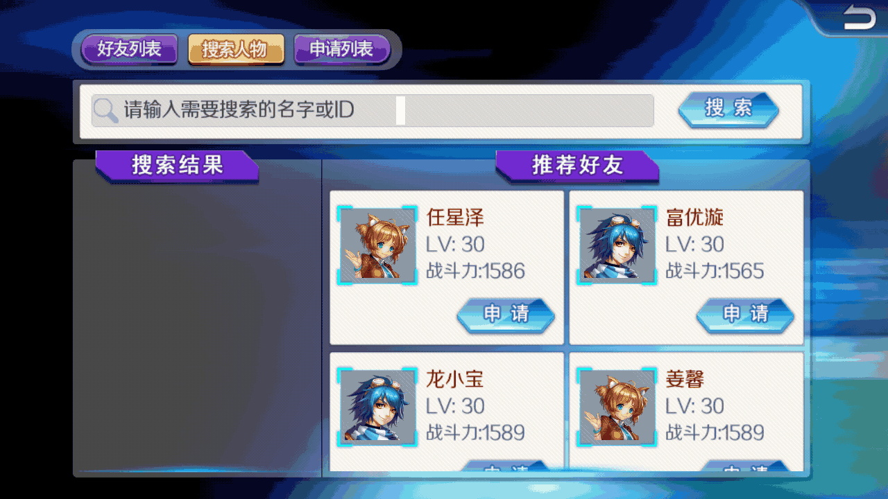 想要芳名远播、名闻天下,我们需要广结善缘,乐于交友,尤其是看到自己喜欢的孩纸一定要主动出击,该出手时就出手。通过在“搜索好友”模块搜索玩家名字或ID进行好友添加申请,只要对方同意你们就是好友了。如果是没有锁定的目标,不知道选谁作为自己的好友时,不用着急,【超级功夫】来当红娘,来为你牵线搭桥,在“搜索好友”模块内有推荐的好友,你只要直接点击“申请”就可以了。