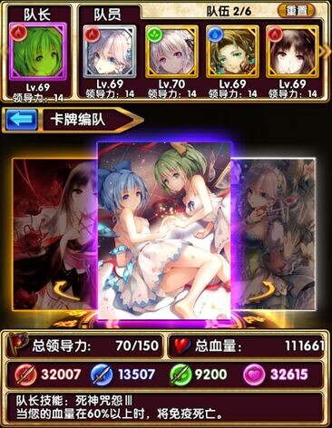 队长选择:前期只需在抗秒杀BOSS时带上有死神咒怨的队长抗下乾坤一掷就行。后期刷到丘比特后,选回复攻击高的。