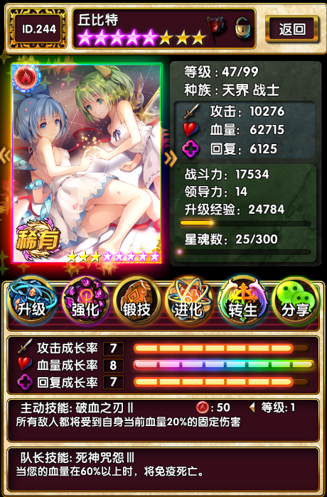 丘比特:稀有本掉落4星卡。唯一的3级死神咒怨技能,血线从75%降到了60%,在后期回复快到极限的情况下,少了这15%的限制意味着你能多提升将近四分之一的血上限。