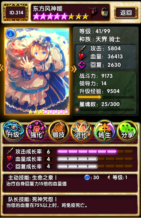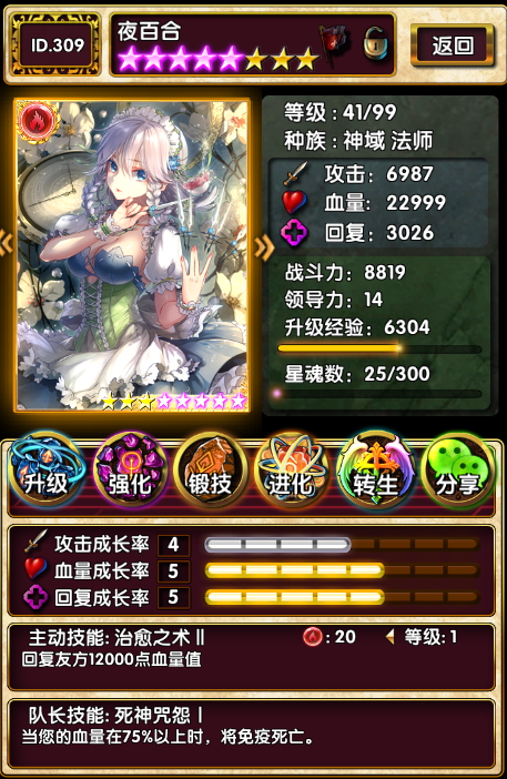 东方风神姬:主线11章BOSS掉落和钻石抽抽到4到6星。此卡相比上面的夜百合主动技能从固回变成了百分比回,但是本身职业是骑士恢复成长一般,另外相比下面要说的七夜,少了宝藏这一稳定来源,所以没有培养必要。