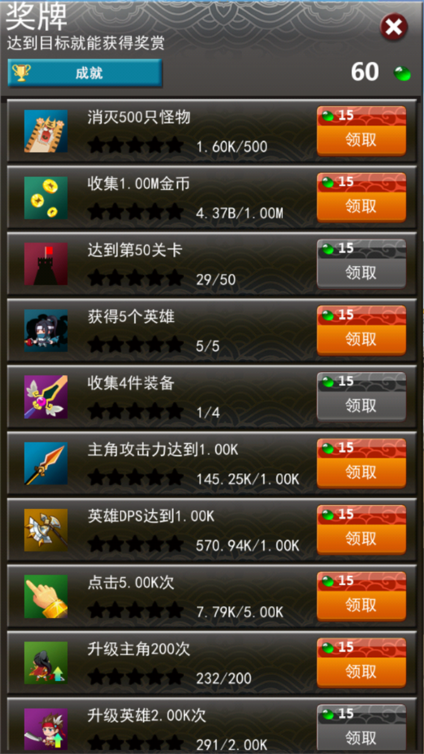 但是,细心的玩家会发现,在屏幕左上方的那个“小奖杯”——游戏的成就系统,点开它以后你会有意想不到的惊喜,那就是各种玉石奖励~奖励颇丰,下图是小编连点半个小时的成绩~(小编对自己的手速很有自信~恩……别想多了~)