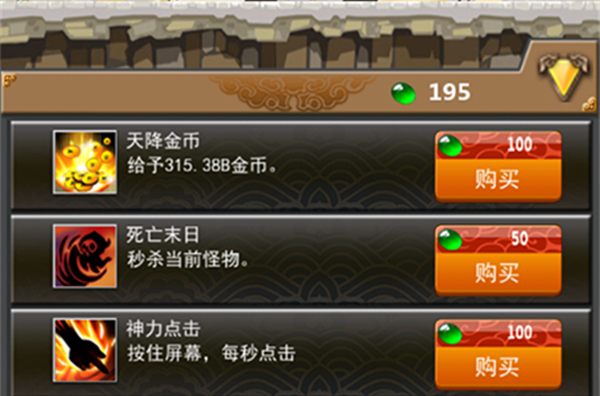 完成任务获得足够的玉石之后,我们真正“抖”起来的时刻就来到了!直接购买商店中的“天将金币”,可以获得大量金币,远超你当前等级的收益,升级主角瞬间变得易如反掌,但要提醒大家,关卡数越高能换取的金币越多,所以伙伴们坚持到你点不死Boss的时候再换取金币才是最佳时机,小编我是单挑到了45级购买的金币,紧接着主角直升500!不犹豫~之后这款游戏的打击感猛然间出现在眼前,“一击秒Boss”绝非空穴来风~那种感觉~~~一个字“酸爽”!