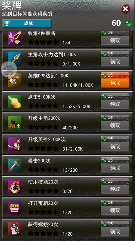 当然非付费玩家也同样可以获得玉石,有木有看到在游戏画面左上角有个“奖杯”。点开后可查看到各种成就,达到要求可以获得一定数量的玉石。每个成就都有5个星级的档,每达成一颗星,可获得的玉石也会翻倍哦!