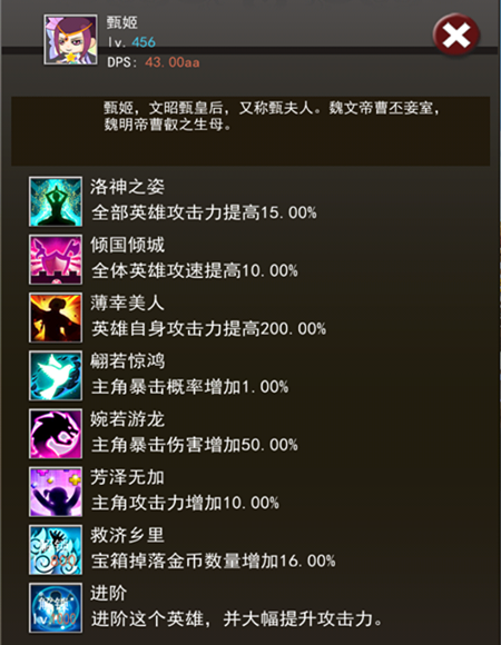 正史中记载甄皇后虽然与曹丕是二婚,但是婚后依旧贤良淑德,相夫教子。更有种说法,就连曹丕的兄弟曹植都为嫂子撰写了《洛神赋》以示爱慕之心。有这样的妻子,男人在外征战沙场,更无须担心家里后院儿起火了~在《点点点三国》游戏中前期玩家就可以招募甄姬,伤害输出可以说是女中豪杰~