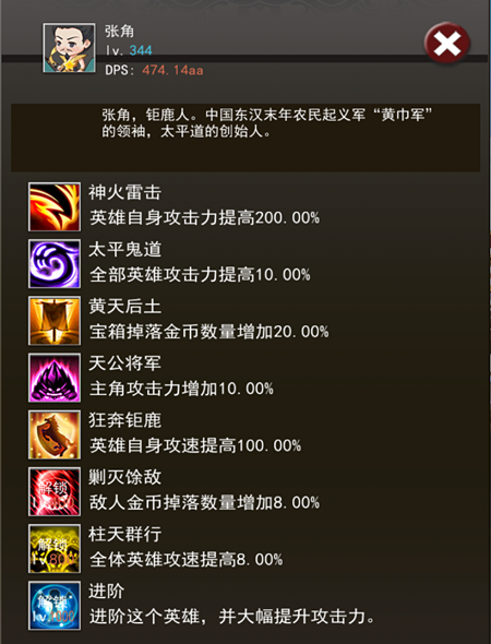 只看技能名称的话,张角在《点点点三国》中绝对是法师这类的设定,游戏中期将有机会招募此英雄,其DPS在那个阶段是击败Boss的关键辅助英雄。