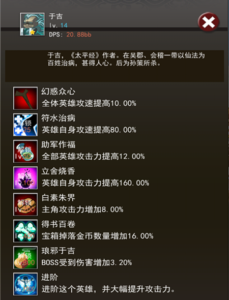 而在游戏中,于吉也是一位了得的辅助武将,招募时间在中后期,基础输出比其他英雄不知道高到哪里去了,但每升一级会消耗大量金钱,这应该就是传说中的“力量的代价”吧~但只要得此人,在游戏中后期基本可以“见神杀神,佛挡杀佛”,相信偶,没错的~