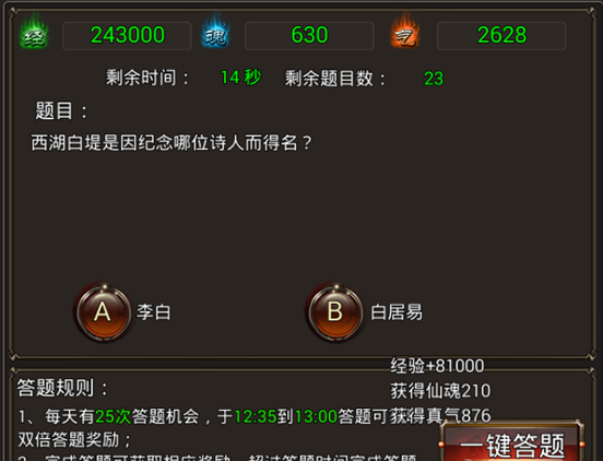 1、每天可通过日常面板选择金榜题名。共有25道题,可24小时进行答题。可获得大量的经验、仙魂、真气。