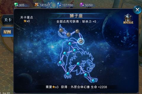 在关卡获得星点后,可在星座系统里面使用星点点亮星座,每次点亮星座中的一个星星就可以给自己增加一定的属性,点亮一个星座的全部星星更可以获得斩杀力的加成!