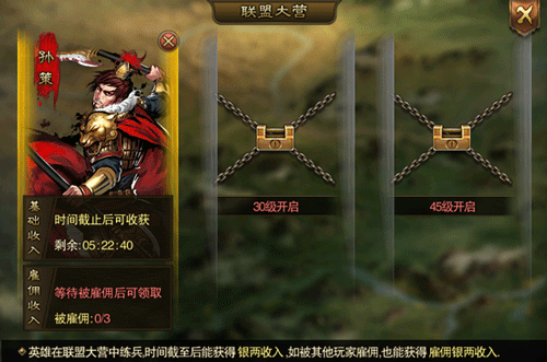 一:联盟大营,您可以将自己的武将放进联盟大营,联盟内的其余玩家可以在主线战斗中雇佣您的精兵良将,这将极大的帮助其他玩家攻克一些难度较大的城池。同时您的武将被雇佣之后,除了日常收入外,您也可以获得一笔不菲的雇佣薪酬,这是双赢的局面,所以,记得将你最强的武将放进联盟大营,互助互利,“兄弟,让我帮你一把~”