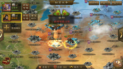 三:联盟战,目前游戏内的主要玩法之一,同样是以联盟为单位进行的战斗,与上述的玩法不同,联盟战是四家实力接近的联盟之间的博弈,这时候,就是真正显示盟主实力与智慧的时候了,联盟战的详细介绍,您可以看下本专区的其他文章,在这就只简单的说明下,联盟战是四家联盟同处一个战场,实时操作夺取城池资源的游戏,每一个盟友都是棋盘上强有力的棋子,如何有效的阻止敌方联盟的夺城进度,合纵连横,是否需要结盟,还是一盟单干?采取何种战斗的策略,这便是诸位需要考虑的问题了。联盟战的奖励非常丰富,能获取多少,就看联盟的实力和群里的智慧了。