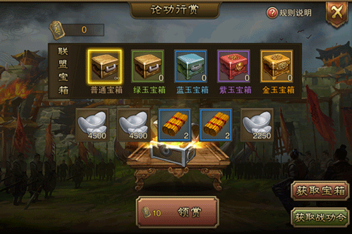 四:论功行赏,玩家可以通过参加上述的两个联盟活动,获取战功令,以战功令来兑换联盟内论功行赏的特别宝箱,最好的宝箱永远都是概率加上先到先得,奖励丰厚到惊人(小编进的太晚,好的宝箱都被领走了)。同时通过击溃个人事件内的敌军入侵也可以获取战功令哦~所以千万不要遗漏了~