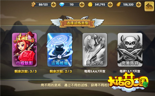 武将试炼这个系统呢在主公等级到达25级后开启,进入后共有4个本本,因为本本周期性的设定,主公每天只能挑战指定的本本,其余灰色的本本无法进行挑战。