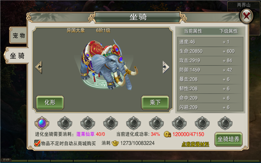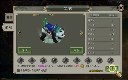 3.升级坐骑消耗蓬莱仙草,坐骑的等级与主角等级无关。
